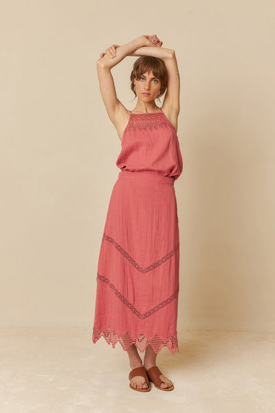 We, at Jorge Lifestyle, love the Double Gauze Skirt in Sandia and made in organic cotton by Indi And Cold for its elastic waist, hidden side pockets, and lace inserts.