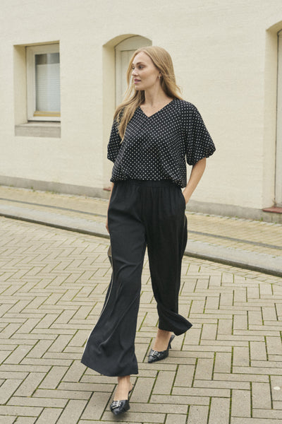 This Kaffe Wide-leg trousers feature a flowing silhouette and soft appearance, complete with an elasticated waistband for adaptable comfort and ease.