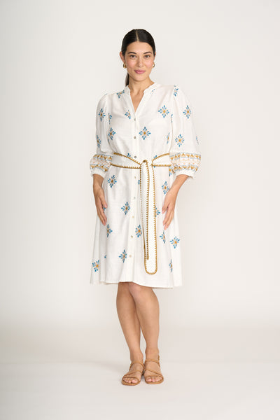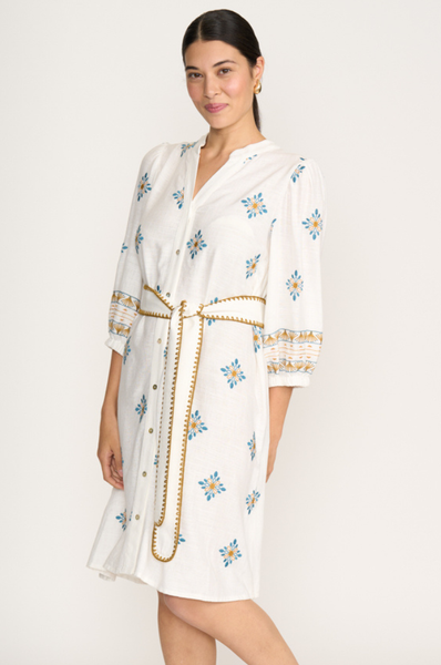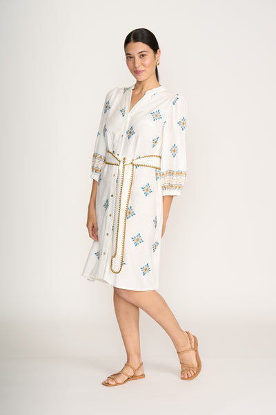 Made from a soft viscose-linen blend, this breezy dress features 3/4 sleeves with elasticated cuffs, a flattering knee-length cut, and a self-tie belt to define the waist.