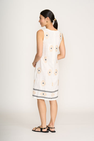 Crafted from a breathable blend of 70% viscose and 30% linen, it features a sleeveless cut, crew neckline, and flattering knee-length silhouette — perfect for warm days and easy layering.