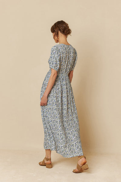 Meet the Bow Shaped Neck Dress in Indigo by Indi And Cold. This dress features a gathered neckline that gives it a bow look, short puffed sleeves, and a very ladylike silhouette.