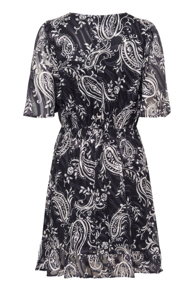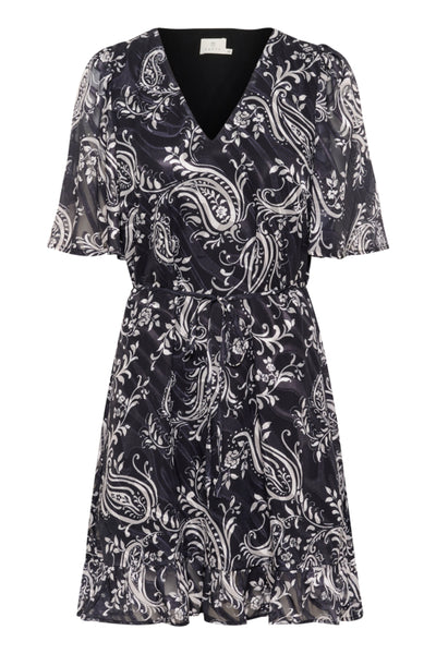 The Kaffe Short dress with all-over paisley print, featuring a V-neckline, sheer flutter sleeves, belted waist, and flounced hem.