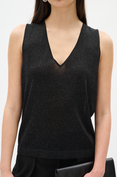 The Thani Tank in Black by In Wear is a knit tank top with a fine rib hem. This sleeveless v-neck top is a versatile layering piece or standalone statement. The shimmering texture, straight silhouette, and feminine neckline elevate this modern essential.