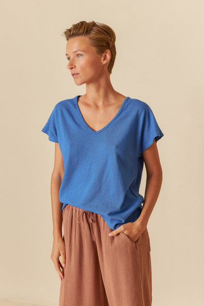 The Rustic Effect Melange T Shirt in Azul Klein by Indi And Cold is made of cotton and linen.