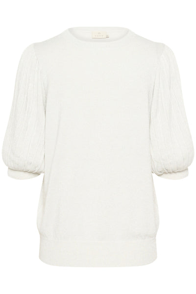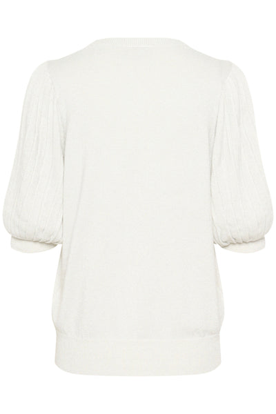 Kaffe Soft knit top with a round neckline and elbow-length puff sleeves featuring a delicate ribbed texture.