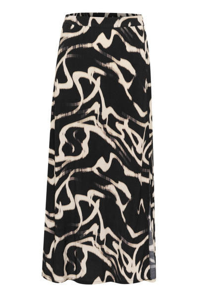 The KAmartha Skirt in Black/Nature Organic Lines by Kaffe has an abstract pattern, straight silhouette, high waist, and side slit.