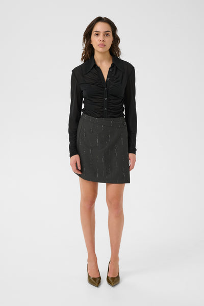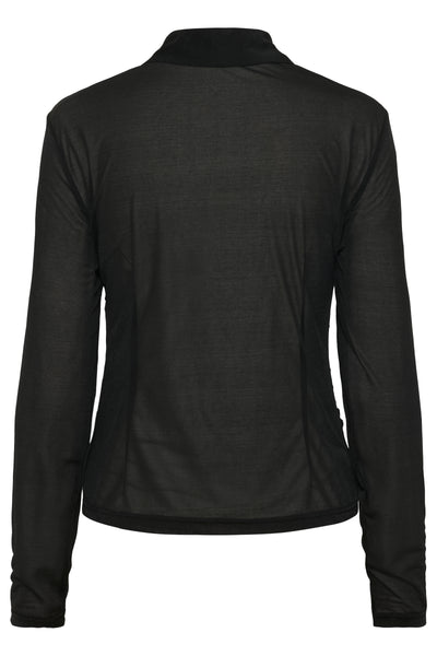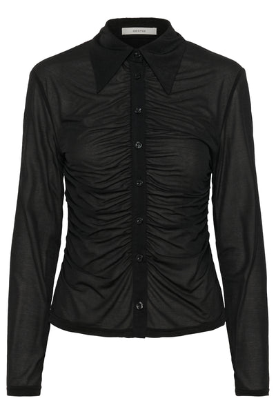 The GZabbie Shirt in Black by Gestuz is a mesh shirt with a fitted silhouette, ruched front, and classic collar. Features a full button closure and long sleeves, offering a sleek and structured look.Â