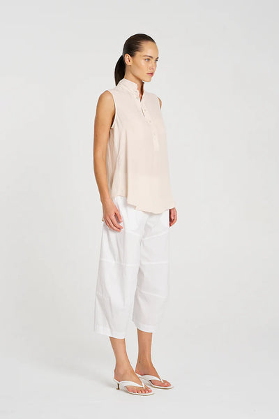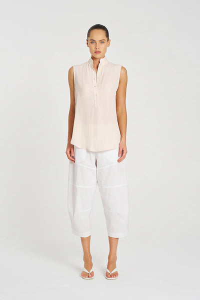 Cut from Mela Purdie's luxurious Mache fabrication, the Tab Slide Tank in Meringue features a petite stand collar and button placketing through the front. This sleeveless shirt is designed for longevity, the perfect tactical layering piece.