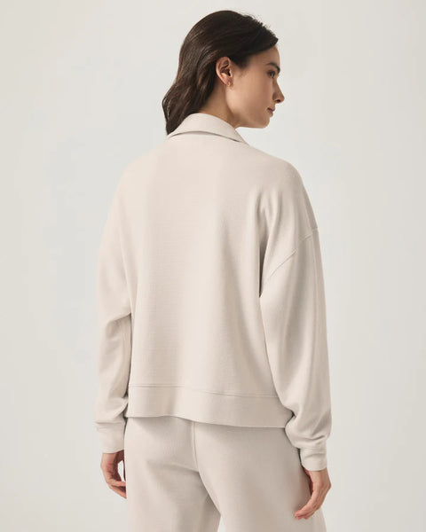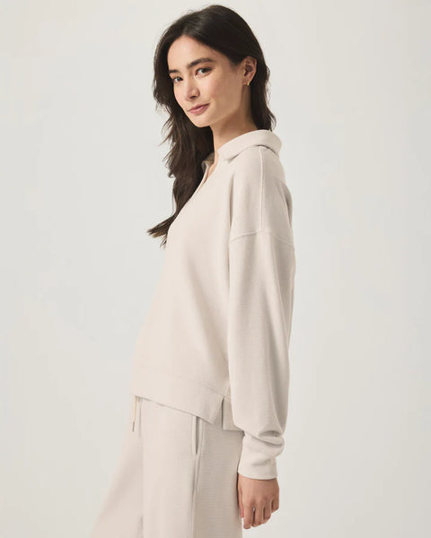 The Waffle Scuba Polo Sweatshirt in Moonstone by Splendid combines the smooth feel of scuba fabric with the texture of a waffle knit for an elevated design yet cozy result.