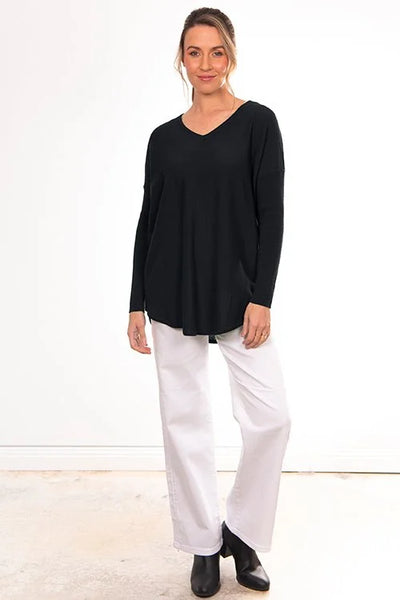 The Queen Vee Neck Curved Hem Pullover in Black by Bridge And Lord is cut in a gloriously soft handle merino cashmere blend.Â