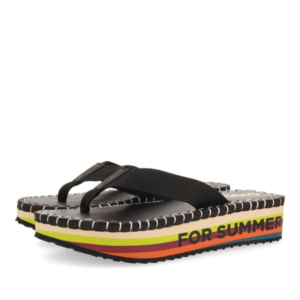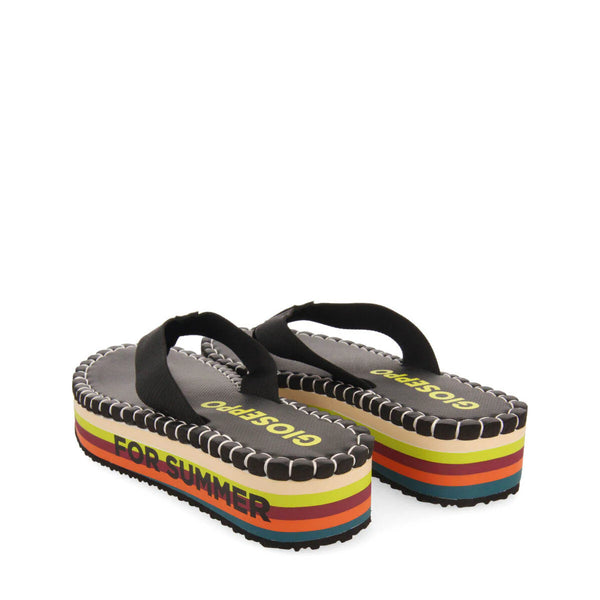 Black sandals featuring straps, multicoloured EVA platforms and decorative topstitching on the inner soles. Soft insoles and very light EVA soles. Don't let them out of your sight!