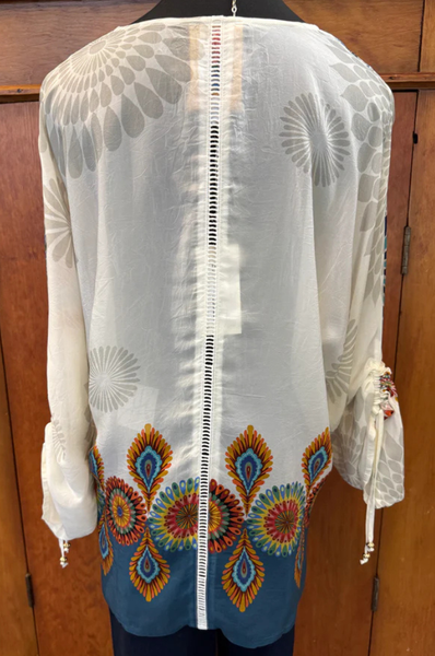 Beautifully crafted with a rich feel, the Erykah Blouse in Zaria by Johnny Was is designed with a V-neckline and relaxed Dolman sleeves. This unique blouse features drawstrings along the sleeve outseams for a customizable fit.