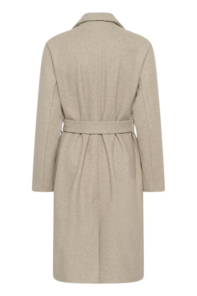 The KAsaturn Jacket in Beige Smoke Melange by Kaffe is a long coat with classic notched lapels, a belted waist, and a straight silhouette. Features full-length sleeves and a streamlined, minimalist design. Versatile layering is essential with structured tailoring for a polished look.