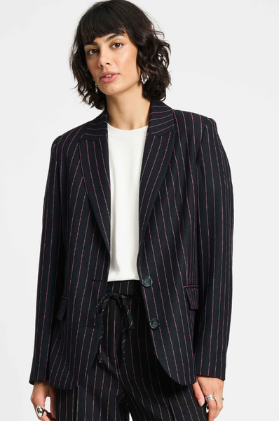 Businesslike on the outside, playful on the inside. The Noir Striped Blazer in Black by Pom Amsterdam is a pinstripe blazer with a pink stripe and printed lining that adds power to your look.